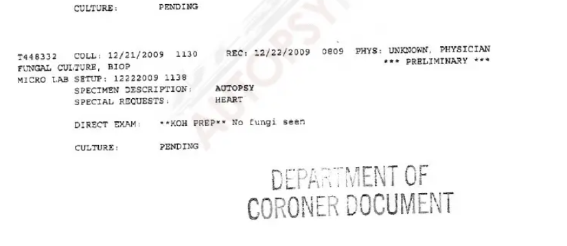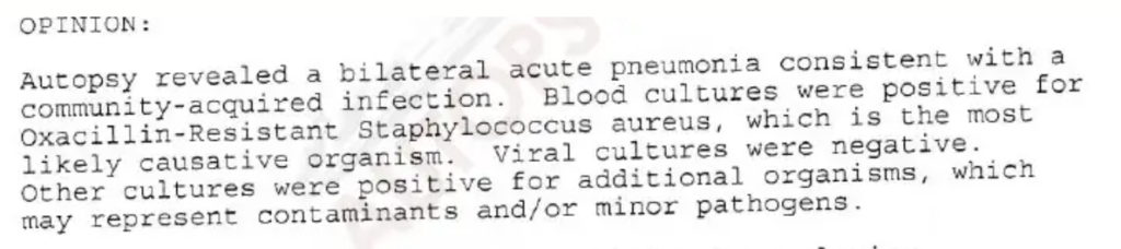 What is interesting, according to the LA County Coroner report, they identified staphylococcus aureus (staph bacteria) in her lungs as a major factor in the pneumonia that caused her death. It also states that “other cultures were positive for additional organisms, which may represent contaminants and/or minor pathogens.”