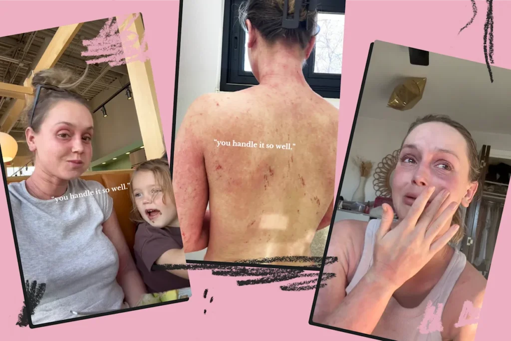 After her third child and subsequent breast implants in March 2023, Matthews developed worsening skin rashes, head-to-toe hives, open wounds, and shakes. She was placed on steroids three separate times and gained 12 pounds of fluid-related inflammation.