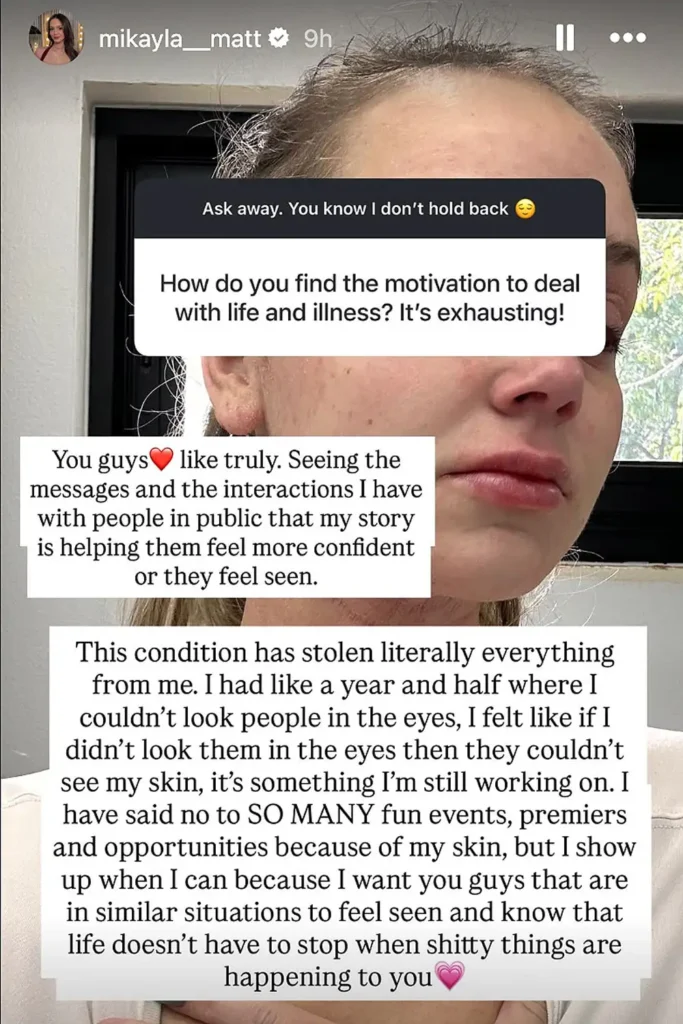 She elaborated that the illness had “stolen literally everything” from her, including her ability to make eye contact with people for over a year due to the visible effects of her skin condition.