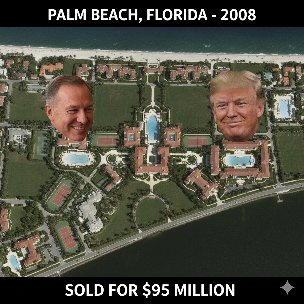 In 2008, Rybolovlev bought Trump’s oceanfront Palm Beach estate, Maison de L’Amitié, for $95 million—a record price at the time for a single-family home in the United States. The massive property, sitting on roughly 6.2 acres with direct Atlantic frontage, was marketed as the ultimate status symbol, with a ballroom, guest houses, a huge pool complex, and over-the-top finishes. Trump had purchased it only a few years earlier, heavily remodeled it, and then flipped it for an enormous profit.
